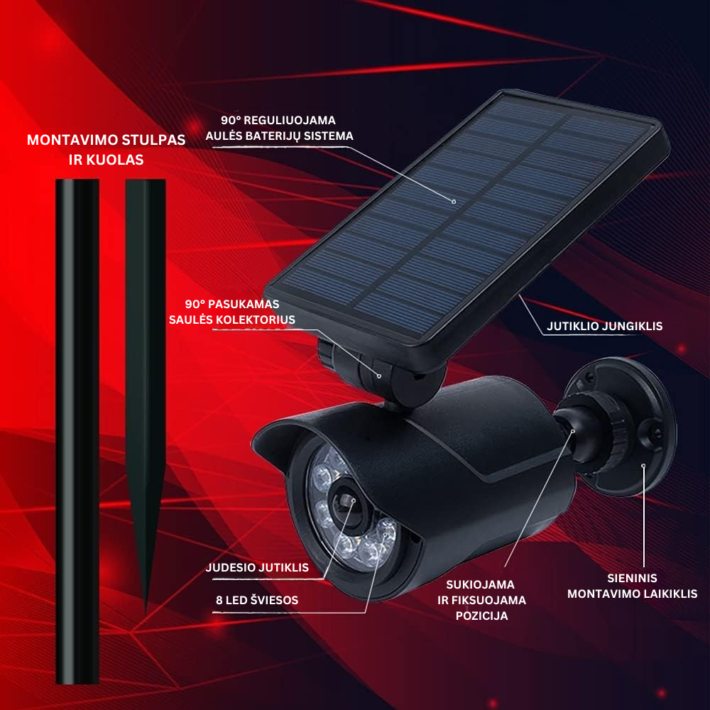 GOAPA saulės energija maitinami LED šviestuvai, imituojantys apsaugos kameros formą, yra ekonomiškas ir efektyvus būdas atgrasyti nusikaltėlius bei apšviesti jūsų aplinką. Šie šviestuvai turi įkraunamą ličio bateriją, kuri, pilnai įkrauta saulės šviesoje, gali veikti iki 8 valandų. Integruotas šviesos ir judesio jutiklis suteikia galimybę pasirinkti iš dviejų apšvietimo režimų pagal jūsų poreikius. Montavimas yra paprastas ir nereikalauja laidų – tiesiog įstatykite šviestuvą norimoje vietoje, pavyzdžiui, sode, vejoje, terasoje, kieme ar takuose. IP66 atsparumo vandeniui ir dulkėms klasė užtikrina patikimą veikimą įvairiomis oro sąlygomis.