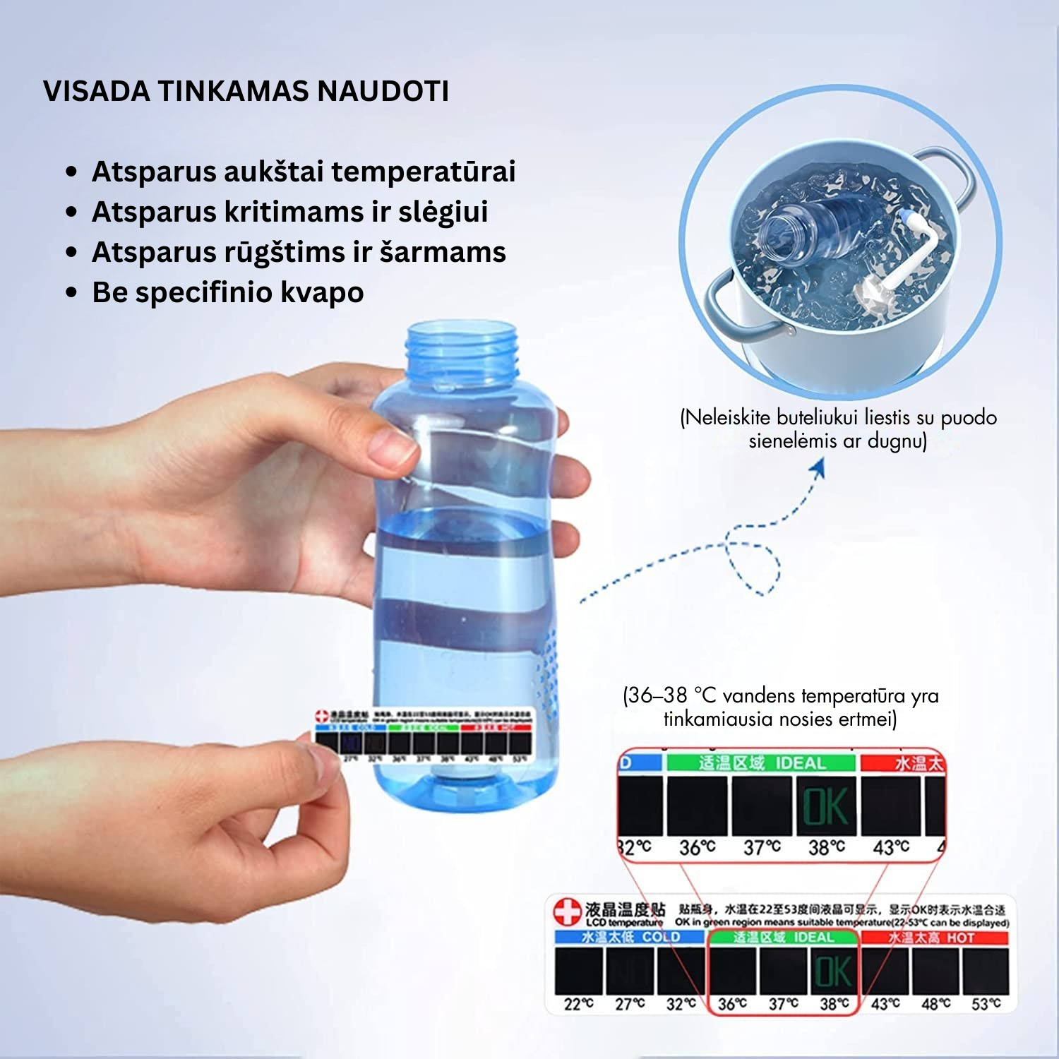 - Užklijuokite temperatūros juostelę ir įsitikinkite, kad vandens temperatūra yra apie 37 ℃;
