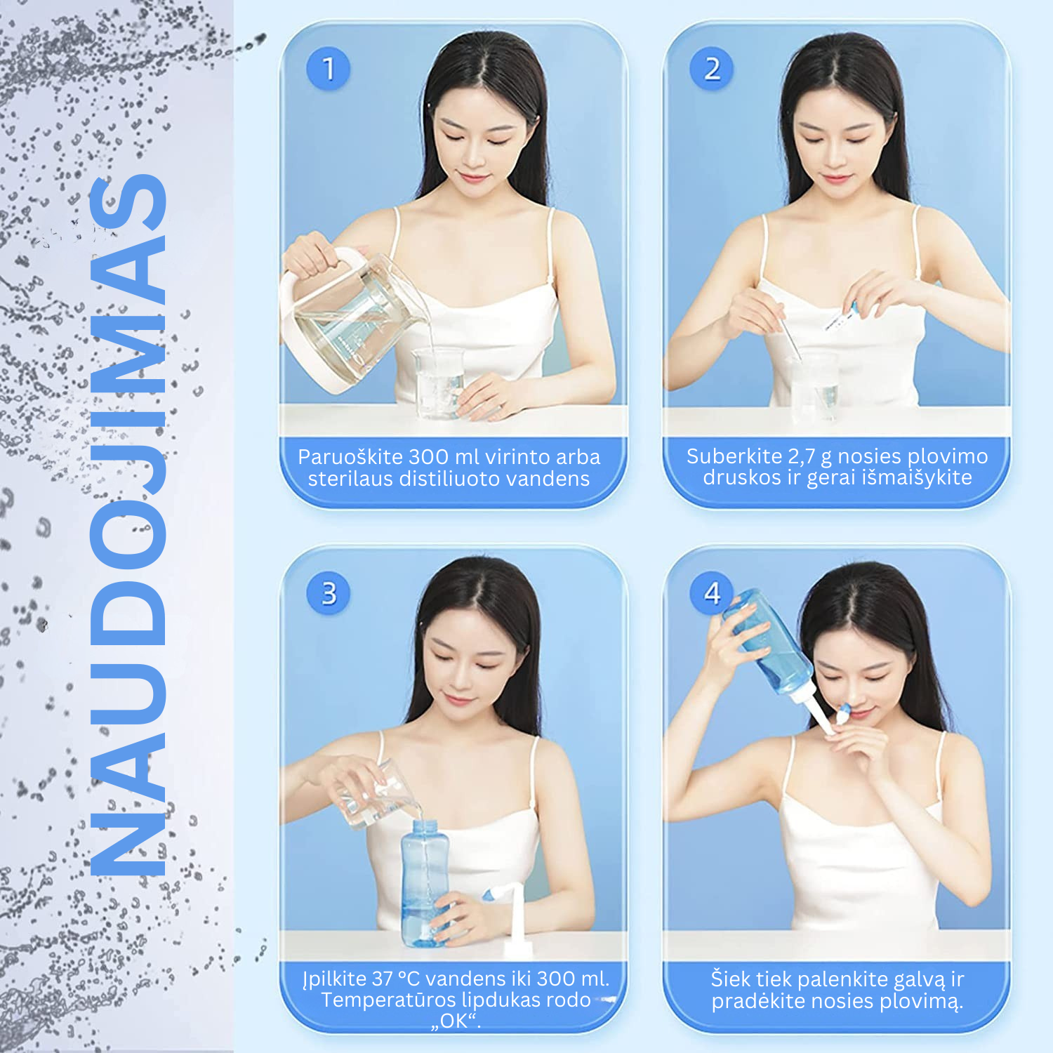 - Net 40 pakelių NASAL skalavimo miltelių, specialiai skirtų valymui bei drėkinimui palaikyti. Miltelius sudaro: natrio chloridas, natrio hidrokarbonatas ir natrio hialuronatas.