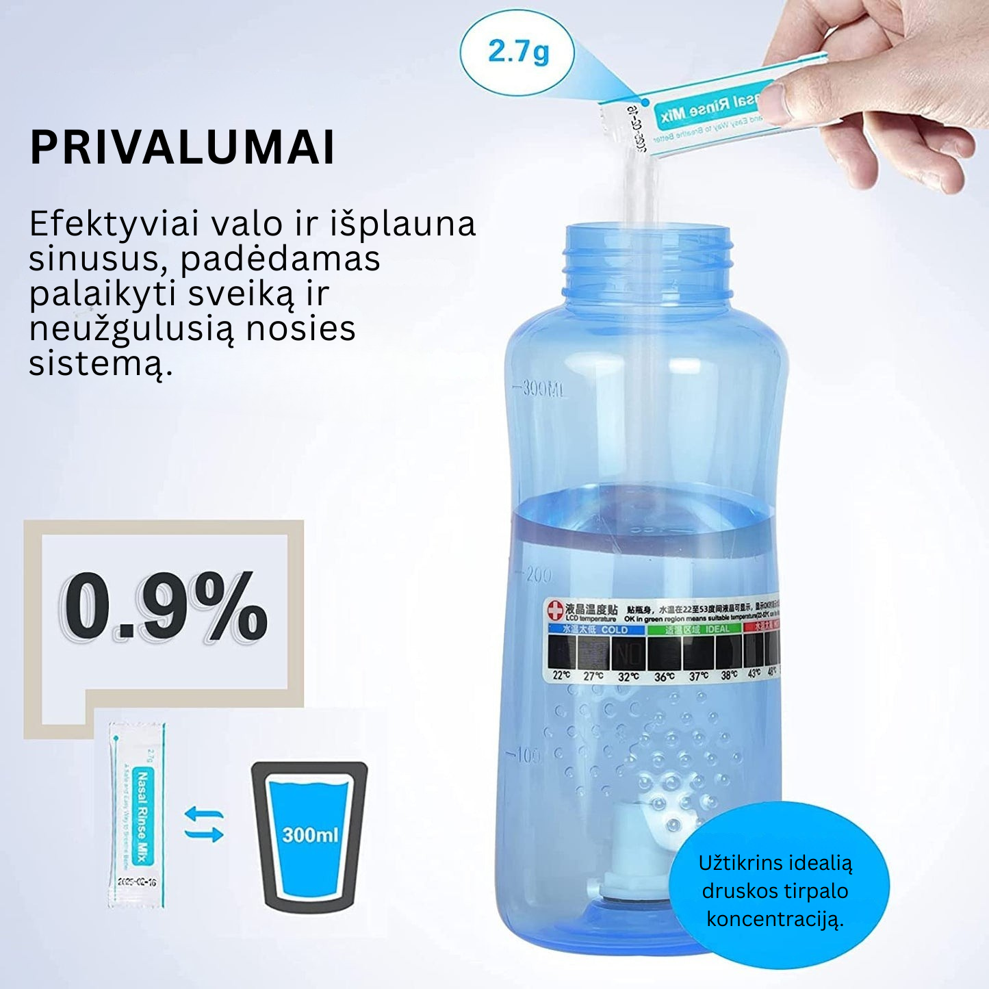 Nosies skalavimo rinkinys giliai išvalo bei sumažina alerginos, peršalimo bei sinuso simptomus.